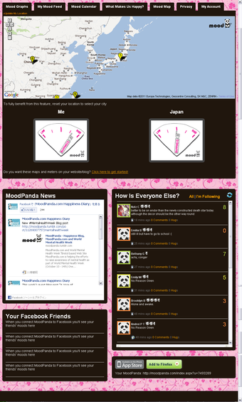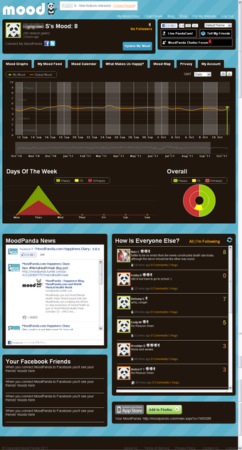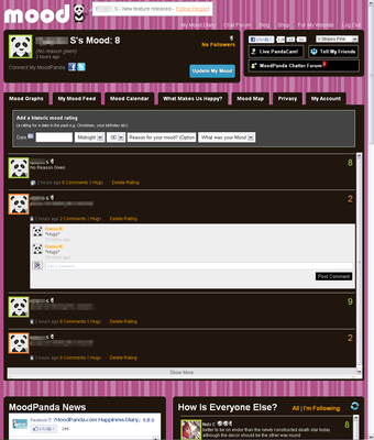 MoodPandaは、Facebookアカウントかメールアドレスでログインします。ログインしたら「Update My Mood」をクリックして気分を11段階の数字から選びます。気がむいたらコメントも入力できます。入力内容はMy Mood Feedタブ内でTwitterのフィード風に表示され、他のユーザーからコメントやHug(ハグ=慰め)をもらえます。TOP画面にあるMood Graphsでは、数字を元にした線グラフや円グラグが表示され、感情の波の傾向を教えてくれます。
